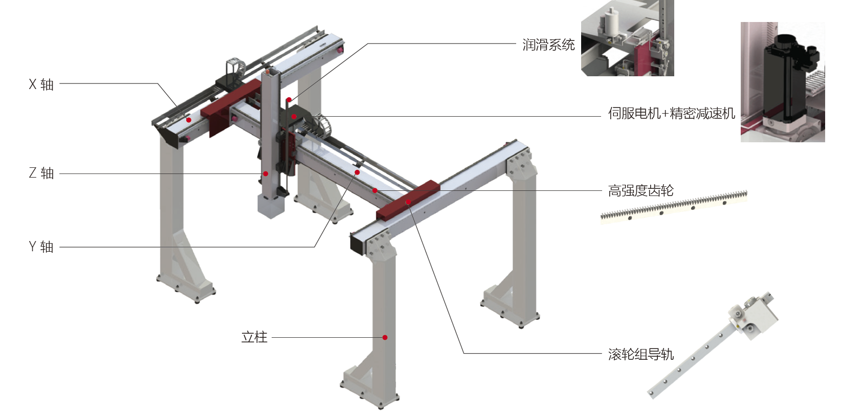 直線式桁架機(jī)器人主要由立柱、Y軸、Z軸、Z軸末端夾具以及控制系統(tǒng)構(gòu)成。